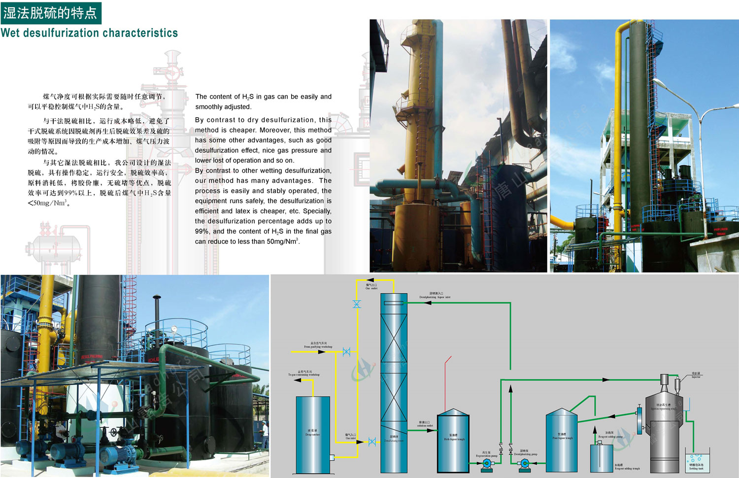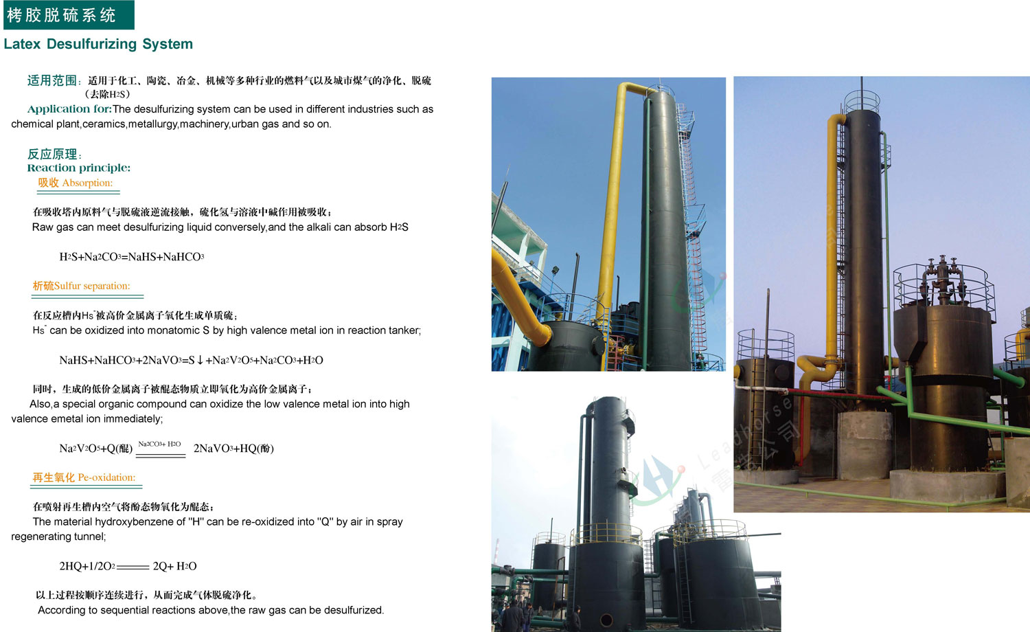 適用范圍:適用于化工、陶瓷、冶金、機(jī)械等多種行業(yè)的燃料氣以及城市煤氣的凈化、脫硫(去除H2S) 反應(yīng)原理:(1)吸收:在吸收塔內(nèi)原料氣與脫硫液逆流接觸,硫化氫與溶液中堿作用被吸收;H2S+Na2CO3=NaHS+NaHCO3 (2)析硫:在反應(yīng)槽內(nèi)Hs被高價金屬離子氧化成為單質(zhì)硫;NaHS+NaHCO3+2NaVO3=S↓+Na2V2O5+Na2CO3+H2O同時,生成的低價金屬離子被醌態(tài)物質(zhì)立即氧 化為高價金屬離子;Na2V2O5+Q(醌)NaCO3+H2O 2NaVO3+HQ(酚) 再生氧化:在噴射再生槽內(nèi)空氣將酚態(tài)物氧化為醌態(tài);2HQ+1/2O2 2Q+H2O 以上為過程按順序連續(xù)進(jìn)行,從而完成氣體脫硫凈化。